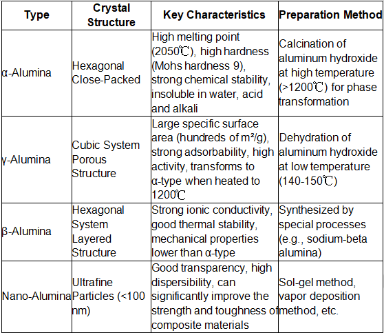 Alumina hautsaren oinarrizko sailkapena kristalezko egituran eta prestaketa prozesuan oinarritzen da. Mota arruntak eta haien ezaugarriak hauek dira: